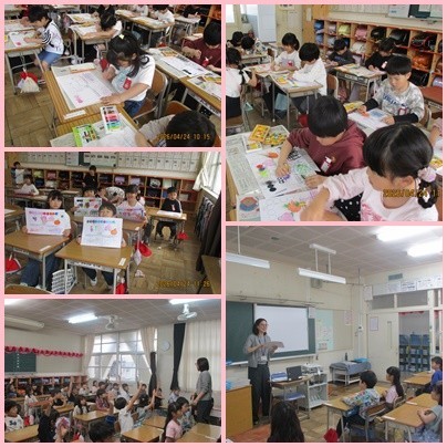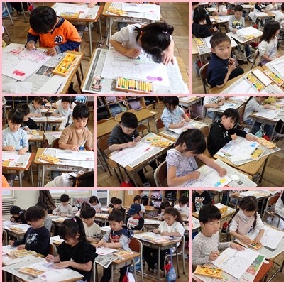 図画工作の学習では、「クレヨンマスター」を目指して「こすりわざ」や「まぜまぜわざ」などに挑戦しました。初めての外国語活動で新しい先生と楽しく学習することもできました。