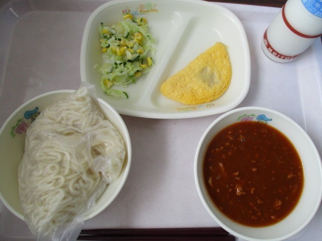 ソフトめんとミートソースは給食の人気メニューのひとつです。ソフトめんは給食用に開発されたもので、一度冷ました麺を朝もう一度蒸し上げて提供しています。