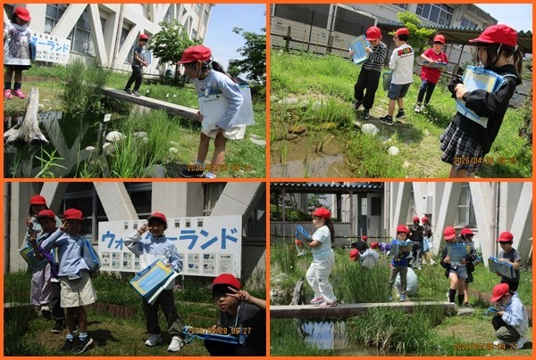 理科の学習で、校庭に生き物探しに出かけました。玄関の周りや、みんな大好き「ウォーターランド」で、ザリガニやメダカ、ダンゴムシ、色とりどりの季節の草花などたくさんの発見をしていました。次は虫めがねを使ってさらにじっくりと観察、記録をしていきましょう。