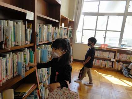 お待たせしました。今日から図書館の本を借りることができようになり、早速図書館へ足を運んだ子どもたちです。