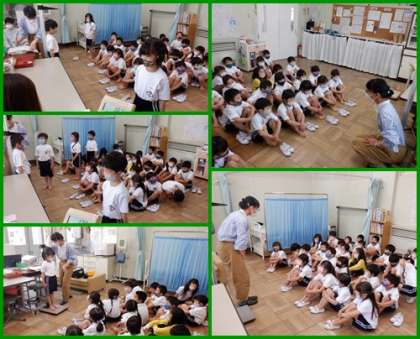 初めての身体測定をしました。身長と体重を測った後で、正しい手洗いの仕方もお話ししてもらいました。これから1年間でどれだけ大きく成長するか楽しみですね。