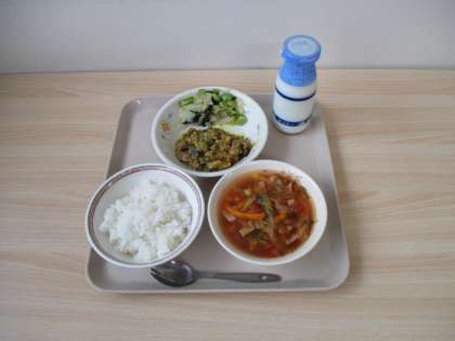 夏野菜と豆腐のキーマカレーは、古知野南小学校の応募献立です。カレー味で野菜を食べやすくし、豆腐を使用してたんぱく質をとれるよう工夫してくれました。