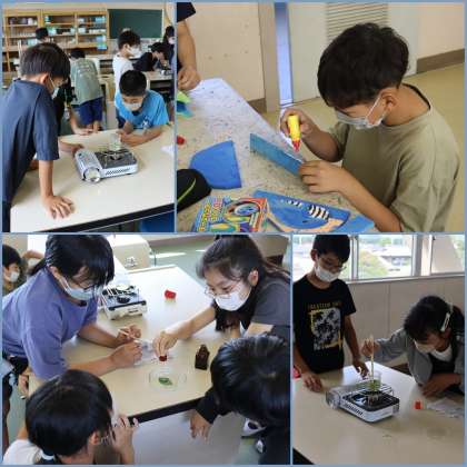 図工の授業では、テープカッターづくりが佳境を迎えています。電動糸のこを使い、曲線を切って組み立てました。完成が楽しみです。