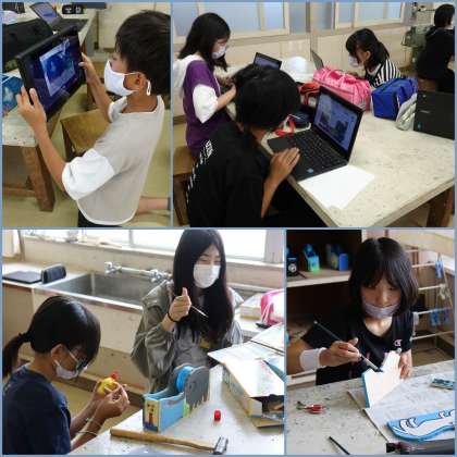 図工ではテープカッターを制作しています。板を曲線を使って切り、一人一人の個性あふれる作品を作っています。電動糸のこをはじめとした道具の扱い方も学びながら、自分のアイデアを形にしようと試行錯誤を重ねています。完成した作品の様子は、タブレット端末を活用して写真に収めています。みんなのすてきな作品を鑑賞し合いたいですね。