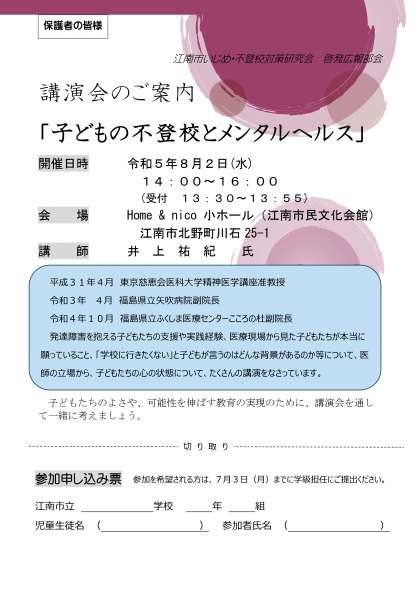 江南市の教職員が所属する、江南市いじめ・不登校対策研究会の主催で、8月2日(水)に講演会「子どもの不登校とメンタルヘルス」を開催します。