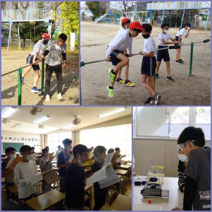 体育では鉄棒運動に取り組んでいます。これまでの学年で身に付けた動きに加えて、上り技や下り技をできるように練習しています。手や足が擦れても何度も練習に挑む様子が多く見られています。理科の実験では、見た目ではなかなか区別ができない水溶液を、区別する方法はないか実験を重ねています。これまでに経験したことのない実験に、楽しみつつ緊張感をもちながら取り組んでいます。