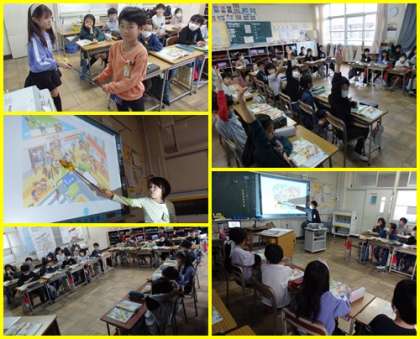 道徳の学習で、ある場面の町の様子から、「みんながくらしやすい町」について考えました。町の中にいる親切な人を見つけ、どういう気持ちで行動しているのかを発表しました。お互いの顔が見やすいように「コの字」の座席になって聴き合いました。発表する人は、聴く人の顔を見ながら話すことを意識しています。