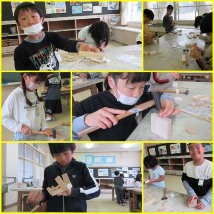 図工は「くぎうちトントン」の作成に入りました。初めて釘打ちした子も多い中、大きなけがなくできました。だんだん釘打ちに慣れて、楽しんでいました。