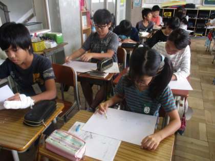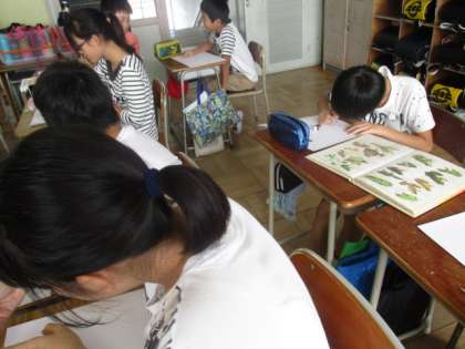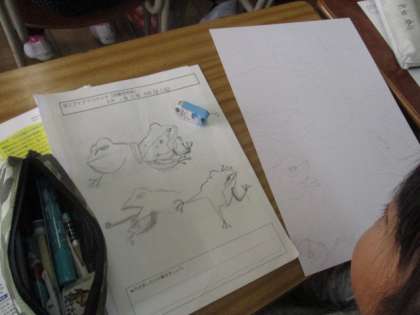 読書の秋、最近では、物語の絵を図画工作で描いています。図鑑を見てまず、見慣れた動物の様子をあらためてつかみ、それをもとに、想像した世界を描き出しています。じっくりと見て、ゆっくりと鉛筆を走らせて、なかなか巧みに、時にはユーモラスに描き題しています。