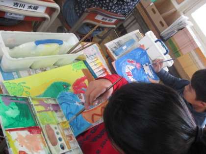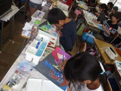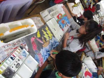4年生は、「かいぶつ石見ー退治」のお話の絵を描いていました。大きな大きなへびのばけものを、それぞれが、個性豊かに描き混んでいました。できあがるのが楽しみです。