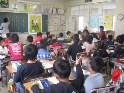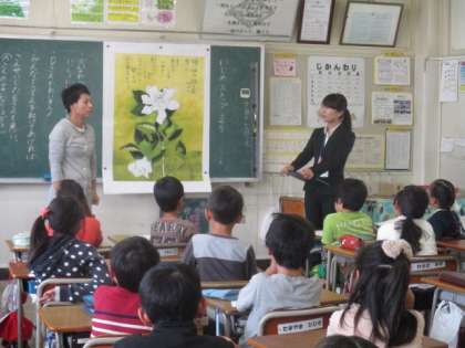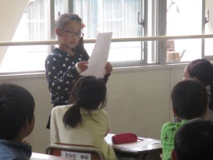 3年3組の道徳です。『いじめストップ』のお話です。一人だけ仲間はずれになりそうな会話です。「Dくんを誘うのやめよ」そんなふうに誰かが言ったらどうしますか。相手を傷つけることがわかっていたら、どんなふうに行動するとよいのか、皆積極的に意見発表をしました。昨日、朝礼で紹介した、星野富弘さんの詩を思い出しながら、重ね合わせながら担任の先生は授業を進めました。教育実習の武藤先生も担任の先生といっしょに授業をしました。