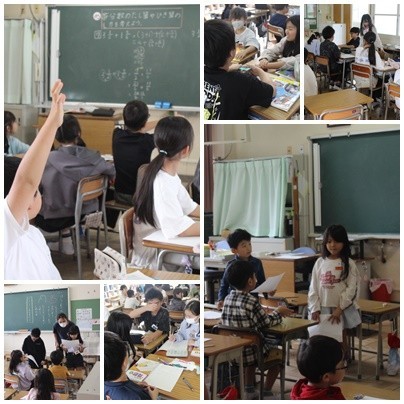 今日4時間目の授業の様子です。グループや全体に向けて説明したり、自分の考えを発表したりしている場面を多く見ました。相手に説明することで、自分の考えがまとまり、さらに学習が深まります。