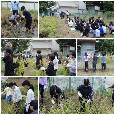 JAの方を講師としてお迎えをし、5年生の皆さんが稲刈りを行いました。まず鎌の使い方を学び、順番に体験をしていきました。見ていることと、実際にやってみることでは随分勝手が違うようで、戸惑いながらも少しずつ稲刈りに慣れてきました。体験後には、「稲刈りは機械で行うことは知っていたけど、こうやって手で刈っていくと、達成感があることが分かりました。」といった感想も出されました。5年生の皆さんは社会科で、農業について学んでいます。そしてこれからもお米を食べていくと思います。こうして稲刈りを体験できたことは、これからの食事でも生かされると思いました。