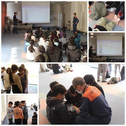 今日は4年生が応急手当訓練を行いました。江南消防署より消防士の方に来ていただき、出血と骨折の際の応急手当について学びました。止血は他人の血液を直接触れることなく、ハンカチなどを使って押さえる方法を知りました。骨折の応急手当には、家庭にあるラップが使えることを知りました。また、ラップの巻き方を動画で知った際には、多くの子たちが自分の予想とは違うことに驚いていました。今日の授業は、今後の生活において、貴重な経験となりました。