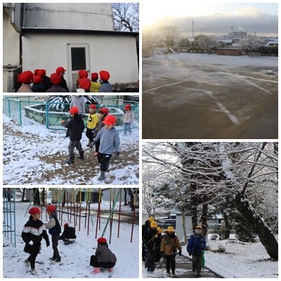 1時間目は、1年生が生活科の学習で雪遊びをしました。屋根からぶらさがる氷柱を見つけて驚いたり、遊具の近くの雪で雪だるまを作ろうとしたり今日しかできない楽しい体験ができました。