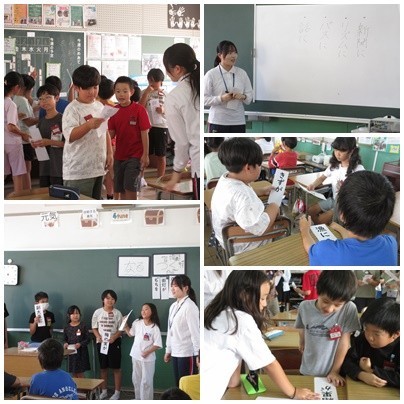 国語科の学習では、教育実習の先生と「いろいろな意味をもつ言葉の仲間集めゲーム」を楽しみました。