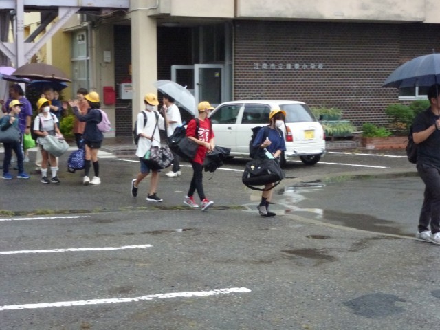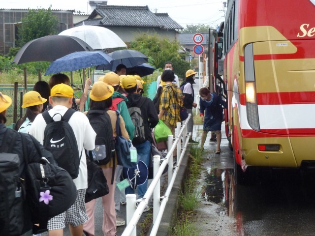 出発式からバス乗車まで。小雨のなか出発しました。