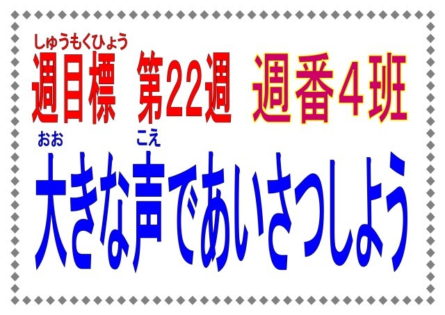10月14日から17日の週目標は「大きな声であいさつしよう」です。総務委員会の活動の一つに、朝のあいさつ運動があります。総務委員があいさつをすると、朝だからなのか、声が小さいように感じます。大きな声であいさつをすると、元気が出てきます。藤里小のみなさんで、率先してあいさつをして、明るい学校にしていきましょう。
