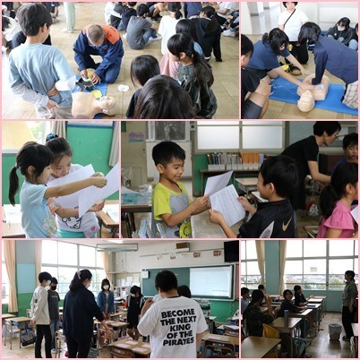 6年生は、消防署の方を講師としてお招きし、応急手当講習を行いました。心肺蘇生法のやり方を教えていただき、実際に人形を使って行いました。命を守るためにどうしたらよいか学びました。