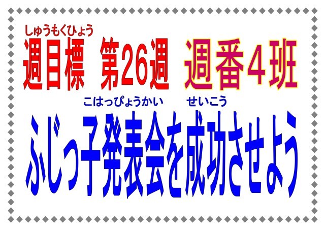 11月10日から15日の週目標は「ふじっ子発表会を成功させよう」です。11月15日にふじっ子発表会があります。どの学級も素敵な発表会になるように一生懸命練習しています。藤里小全員ですばらしい会にしていきましょう。そのためにも、練習をがんばることはもちろん、手洗い・うがい・水分補給をしっかりして体調管理をしましょう。