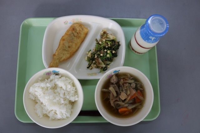 11月8日はいい歯の日です。サラダにはカルシウムの多い小松菜とチーズ、根菜汁にはかみ応えのあるれんこんやごぼうが入っています。よくかんで食べましょう。