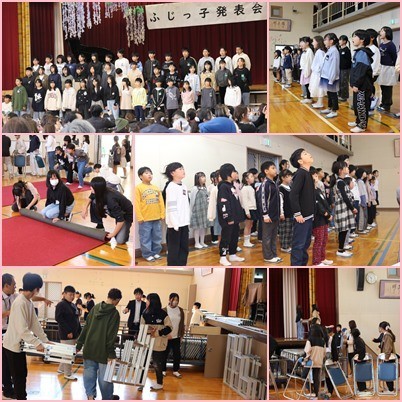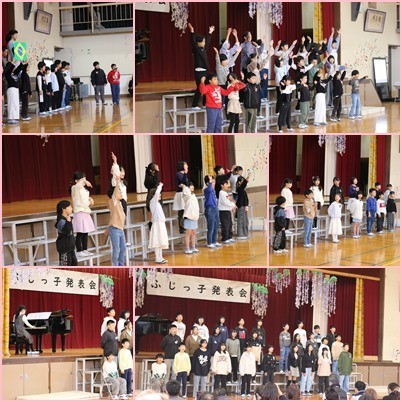 「ふじっ子発表会」に向けて子ども達は、それぞれの学級で練習を重ねてきました。今日の発表では、歌に思いを込めて、披露することができたと思います。校歌斉唱では、体育館一杯に全学年児童の歌声を響き渡らせることができました。また、発表会終了後には、5,6年生の子ども達が会場の片付けを協力して行ってくれました。本日は、多くの皆様にご来校いただきありがとうございました。