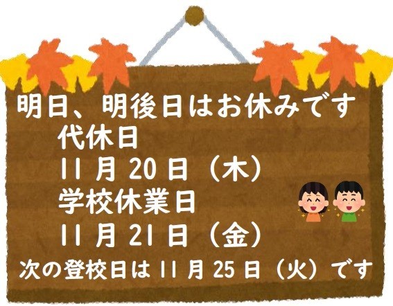 20日(木)から24日(月)の5日間、お休みになります。次に登校するのは、25日(火)となります。安全に気を付けて過ごしてください。25日(火)に元気な姿で登校してくださいね。