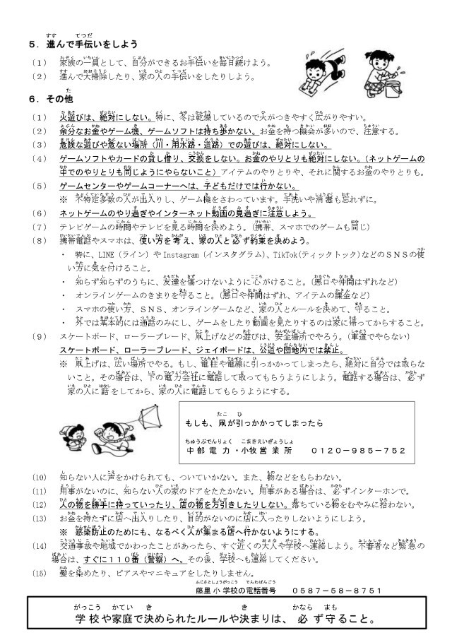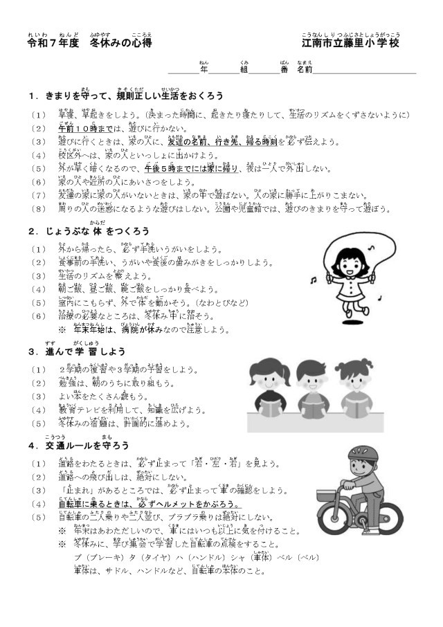 藤里小学校では、冬休みに安全・健康に過ごすことができるように「冬休みの心得」を使って、冬休みの生活について話をしております。ご家庭でも活用していただけると幸いです。よろしくお願いします。