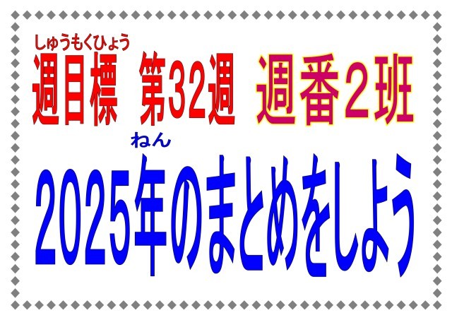 12月22日から23日の週目標は「2025年のまとめをしよう」です。まもなく2025年が終わります。2026年の良いスタートを切るためにも、この1年の振り返りをしましょう。また、最後まで気を抜かずに学校生活を終えることで、充実した冬休みを送ることができるといいですね。