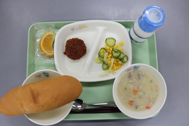 今日は進学、就職応援献立です。新しい道に向かって頑張るみなさんへ、実力を発揮できるよう「勝つ、幸運、花が咲く、いい予感」という、ゲン担ぎで縁起がよい名前の料理や食材を取り入れました。