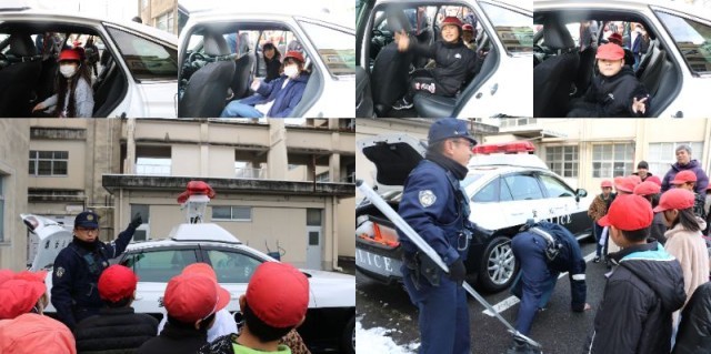 屋外では、職務質問の体験や、パトカーや警察の方が普段から所持している道具を見せていただきました。