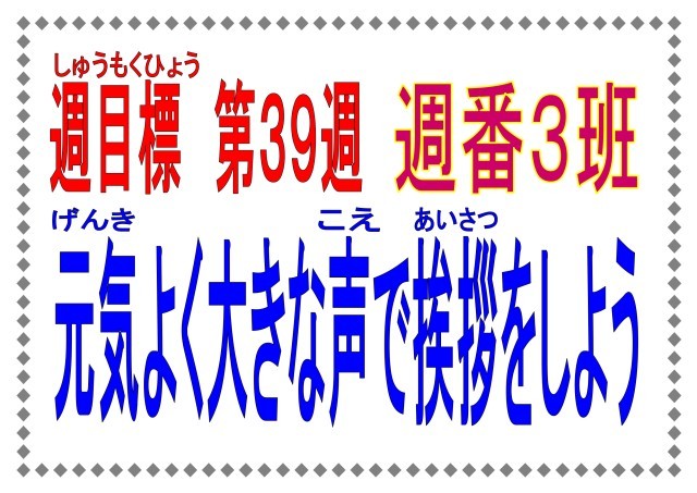 2月16日から20日の週目標は「元気よく大きな声で挨拶をしよう」です。現在、総務委員が企画した気持ちのいい挨拶キャンペーン中です。積極的に挨拶をすることで、心も明るくなります。自分から進んで、気持ちのよい挨拶をしていきましょう。