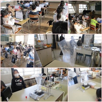 4年生は理科の実験を行いました。水が沸騰しているときのあわの正体を調べるために熱心に観察をしました。