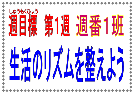 4月9日から17日の週目標は「生活のリズムを整えよう」です。学校が始まりました。朝起きる時間、朝ごはん、寝る時間など改めて自分たちの生活リズムを整えましょう。