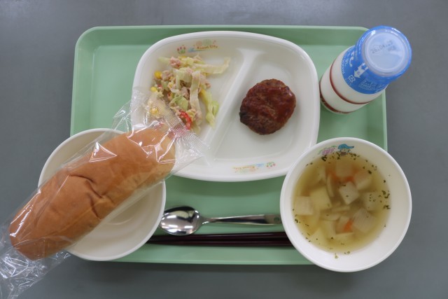 みなさん、入学・進級おめでとうございます。今日のハンバーグは中にソースが入っています。チーズのような食感ですが、乳製品を使っていないソースです。