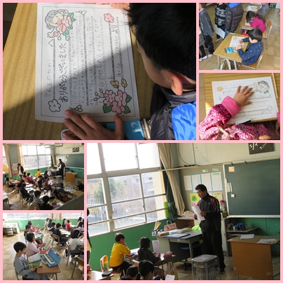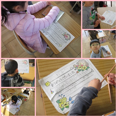 1年1組の子どもたちは、昨日お世話になった老人会の方々にお手紙を書いていました。イラスト入りのとてもきれいでかわいらしいお手紙でした。