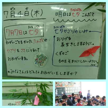 7月7日の七夕の日が日曜日のため、給食では、明日七夕にちなんだメニューとなります。そうめんやたなばたゼリーなどが出ます。七夕について知ることで、食事もいっそう楽しくなりますね。