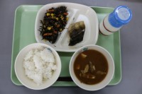 今日は6年生にとっては最後の給食です。明日の卒業式を祝って、赤飯が出ました。その他、かに玉汁・ほうれん草のごま和え・チキンフライ・デザート・牛乳の給食です。