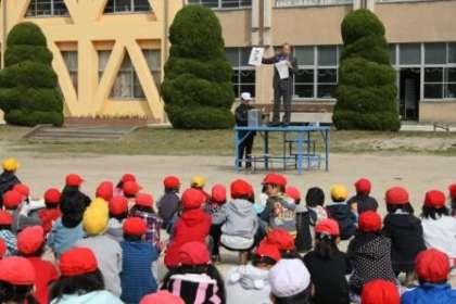 今朝の朝会で、飯沼校長は、みんなに使ってほしくないことばを書いた用紙を、全児童の前で燃やしました。「”アホ・チビ・デブ・ブス・うざい・死ね”などのこれらのことばは、決してつかってほしくないことばです。だから、今日みんなの前で燃やしましたので今まで苦しんでいた人、安心して生活してください。みんな、二度と使わないようにしましょう。みんなが優しい人になってください。」とよびかけました。