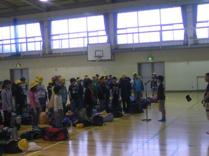雨が降り続いていますが、元気一杯の藤里っ子で体育館は明るさに満ちています。美浜に着くころは晴れると信じています。では、出発式が終わりましたら出発です!