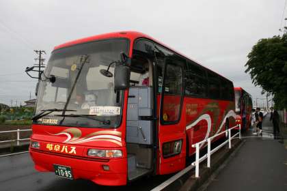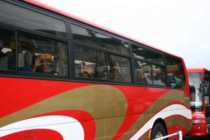 5年生の児童が出発式を終えて、いざ、野外学習に出発しました。バスのなかで、期待がふくらみます。