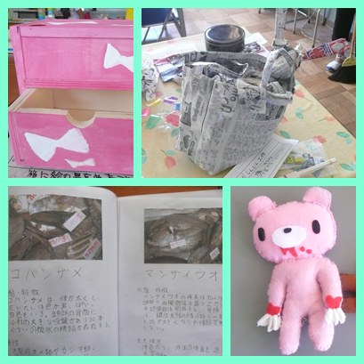 さて、左上から、市原ゆうさんの「アクセサリーボックス」です。色が実にいいですね。市販では決して買うことができない色ですね。靴下なんか入れるに最高です。右へいって、境かんなさんの「新聞工作」です。境さんは新聞で服も制作していました。テープを見せないように工夫してあります。これが5万と言われても、そうかなと思うほどのアートです。左下へいって住藤玄太君の「氷見でとれた珍しい魚」です。氷見市まで行くとはなかなか通ですね。ここは、桃太郎温泉か、ホテルマイアミが有名なんです。(一応、行ったことあるからね・自慢)そして、魚が無茶苦茶うまい所です。子どもでそんな所に泊まっているとイワシが食べられなくなるよ(笑)しかし、コバンザメ初めて見ました。貴重な写真ありがとう。最後は加藤あきなさんの「グルーミィとリラックマ」です。ひとつひとつの縫い目が実に、丁寧にやってあります。表情も最高ですね。縫っている姿が想像できました。6年生で後、これはと思ったのは原来夢さんの「発電について」です。写真で載せにくいのでごめんなさい。でも、今の日本をよく突いています。6年生だけあって、個性がでている作品が多かったです。みなさん、来年は中学校!さらに上へいけるといいですね。(校長)
