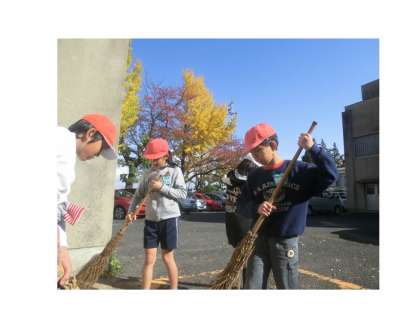 5年生の子ども達が掃除の時間に落ち葉を集めていました。