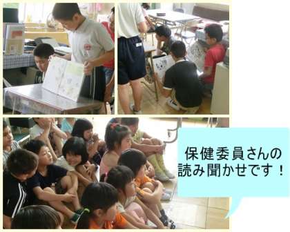 歯と口の健康週間にあわせ、長い放課に保健室で保健委員の子どもによる読み聞かせを行いました。