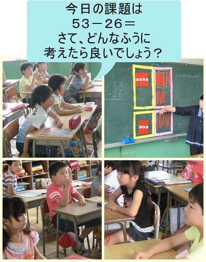 子どもたちは黒板を見ながら、まずは、頭を使って考えています。