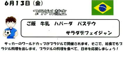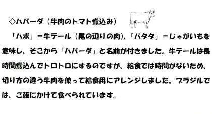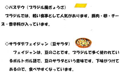 本日の給食は、なんとブラジル料理がでました。栄養士さんも日程にあわせて、献立作りをしています。ありがとうございました