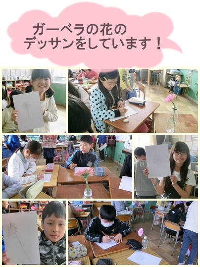 静かに、よく見て、描きましょう。花びらはどうなっていますか。【4年1組図工】