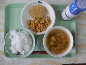 本日の献立は、「ごはん」「たいもコロッケ」「にんじんしりしり」「牛乳」「アーサー汁」です。