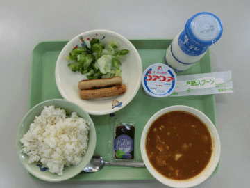 本日の献立は「発芽玄米ごはん」「カレーライス」「焼きウインナー(小2コ) 」「牛乳」「グリーンサラダ(和風ドレッシング)」「ヨーグルト」です。