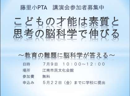 藤里小学校PTAでは,7月9日(木)実施の林成之先生の講演会参加募集をしています。多くの方の参加をお待ちしています。